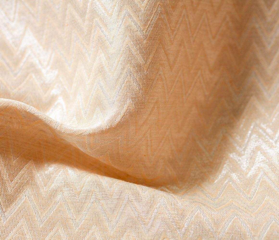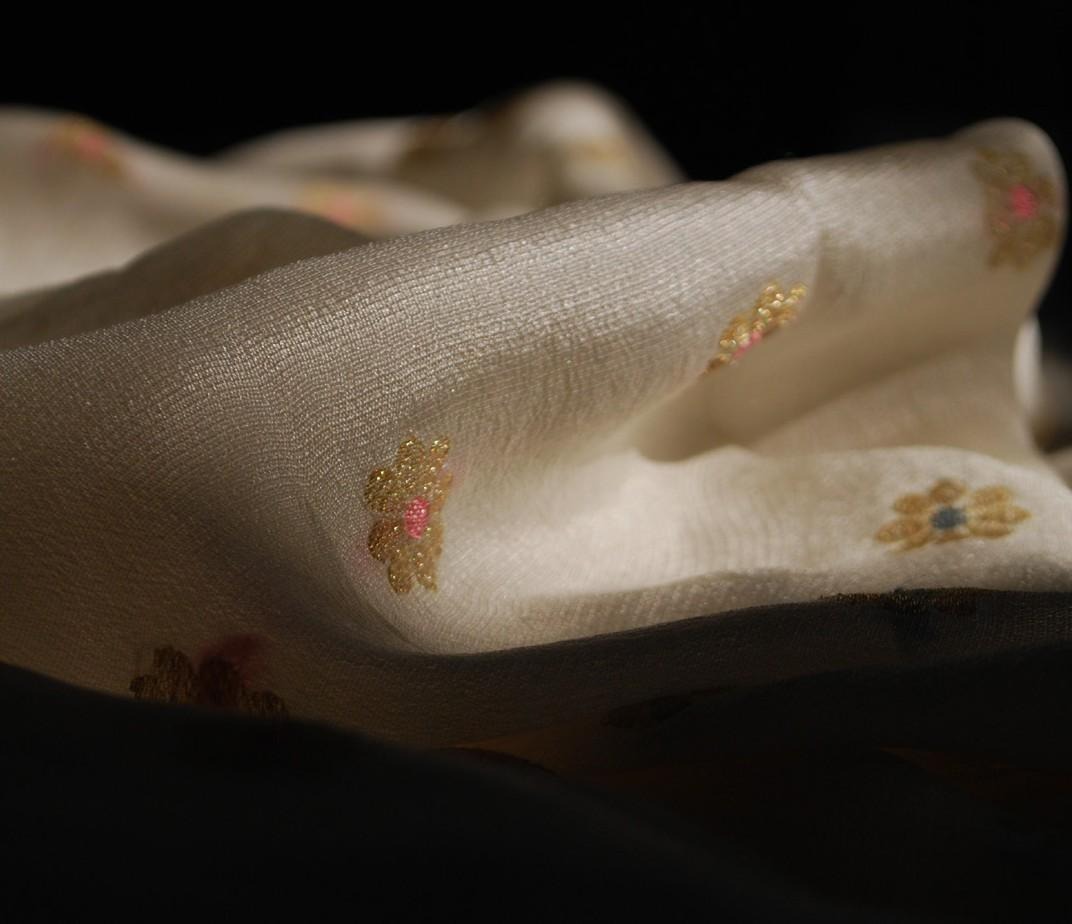 Description: The Jamdani technique of weaving originates in the Indian region of Bengal and is one of the most complicated and intricate types of weaving. The name, Persian in origin, means flower, ‘jam’, and vase, ‘dani’. Historically, the motifs were geometric or floral in nature and were commonly made with metallic threads called zari. Instead of the supplementary weft going from one selvage to the other, the motif is created by passing a small bobbin through specific sections of the warp by hand in between throws of the shuttle. The Jamdani technique can only be created on a hand loom and yields a clean, neat finish on the backside of the fabric that won’t fray.