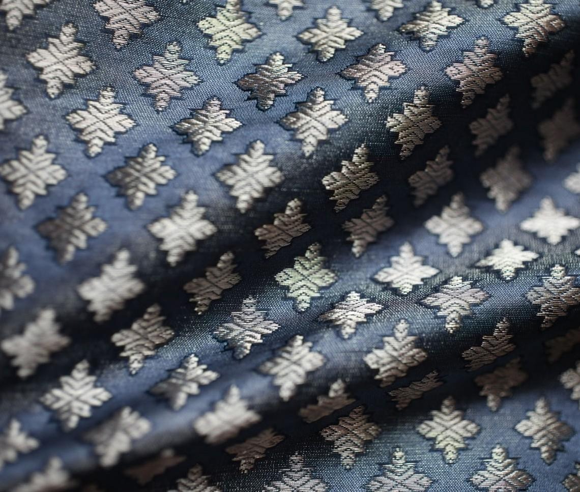 Description: Very closely associated with the city of Varanasi, or Benaras, Brocade is a class of richly decora- tive shuttle-woven fabrics, often made in colored silks and with or without gold and silver threads. The name, related to the same root as the word “broccoli,” comes from the Italian word broccato meaning “embossed cloth”. It is a supplementary weft technique, where the ornamental brocading is produced by a supplementary, non-structural weft in addition to the standard weft that holds the warp threads together. The purpose of this is to give the appearance that the weave actually was embroidered on. Varanasi is renowned for its Benarasi brocades, coveted and worn largely for weddings and special occasions.